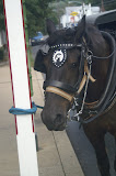 Horse stands patiently at the curb waiting for the drive home. That emblem on the bridle is another sign that this is not an Amish rig.